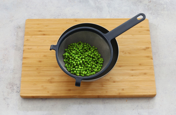 Faites cuire les petits pois dans de l'eau bouillante pendant 7 minutes. Egouttez-les et plongez-les dans de l'eau froide avec des glaçons pour arrêter la cuisson et préserver leur couleur verte. Ensuite égouttez.