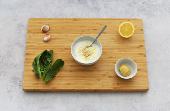 Mettez le yaourt dans un bol. Salez, poivrez, ajoutez la moutarde, le jus de citron fraîchement pressé et l'huile d'olive. Mélangez. Ajoutez l'ail pressé et les épinards hachés.