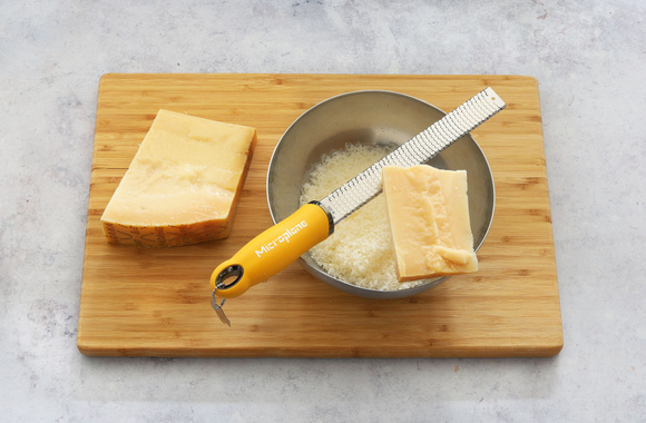 Râpez le Grana Padano avec une râpe Microplane au dessus d'un grand bol.
