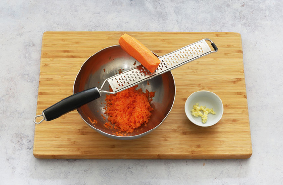 4Epluchez les carottes, râpez-les avec les dents larges d'une râpe au dessus d'un saladier. Epluchez l'ail râpez-le et ajoutez-le aux carottes.