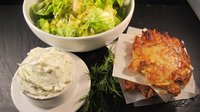 Latkes, galettes de pommes de terre, croustillantes, recette d'Europe de l'est. Vous pouvez l'agrémenter avec d'autres légumes, comme courgettes ou panais. Pour un dîner frugal, c'est parfait avec du cream-cheese Philadelphia, on pourrait se croire à NYC.