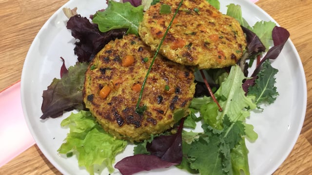 Faire chauffer une poêle avec un filet d’huile, y déposer les galettes et les faire dorer 2 minutes de chaque côté. Puis les disposer sur du papier absorbant.