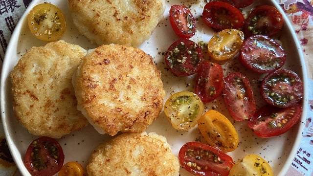 Il est important de préparer cette recette avec un reste de risotto qui a séjourné une nuit ou une journée au frais. L'amidon contenu dans le riz va refroidir et permettre aux galettes de tenir à la cuisson sans problème. C'est assez magique.