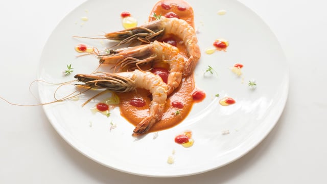 Verser la sauce et poser les gambas dessus. En décor, faire des points de Passata (avec les 100g réservés) et d'huile d'olive, parsemer de fleurs de sarriette.