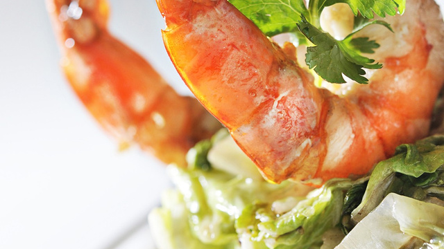 Décortiquer les gambas et émincer le chou. Assaisonner le chou émincé avec le jus du citron, la sauce soja et quelques feuilles de coriandre. Bien mélanger.
