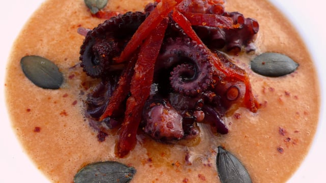 Dresser le gazpacho surmonté d'oignon rouge et de poulpe, ajouter le chorizo et les graines de courge. Poudrer de piment d'Espelette.
