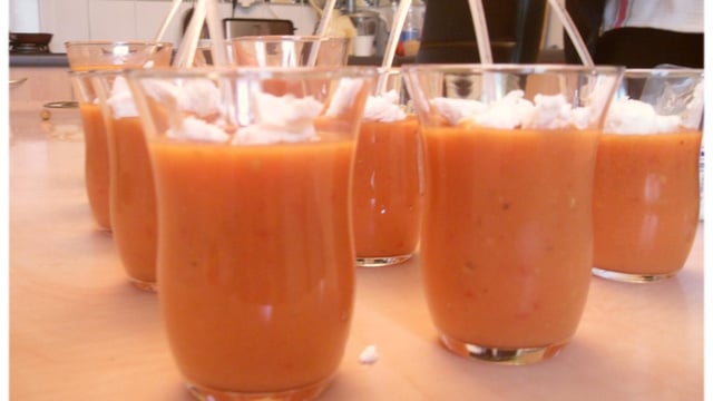 Au moment de servir, répartissez le gaspacho dans des verrines, ajoutez les cubes de fromage de chèvre et décorez de feuilles de basilic.