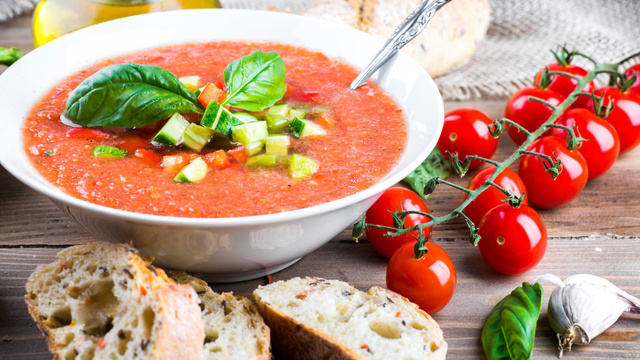 Vous pouvez agrémenter votre gaspacho avec des croutons de pain grillé et du basilic frais ciselé.