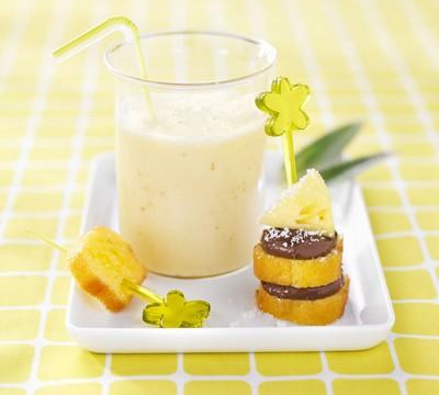 Couper les Moelleux Pocket 25g Authentique Ker Cadélac en tranches. Avec de jolis pics, réaliser des mini brochettes en alternant un cube d'ananas et deux tranches de mini moelleux recouvertes de pâte à tartiner. Saupoudrer de noix de coco râpée.