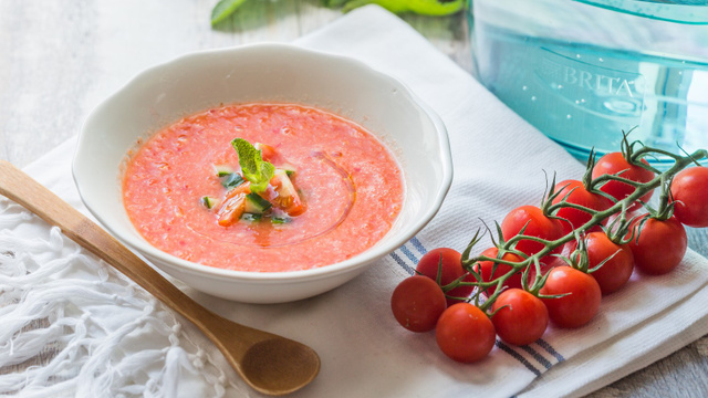 Une soupe froide à base de tomates, concombre, poivron, ... qui se déguste parfaitement en apéritif ou en entrée.