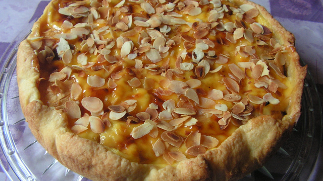 Préparer un pudding avec la préparation en poudre, la crème, le lait et le sucre en suivant les instructions sur l'emballage puis cuire la masse et la laisser refroidir. Abaisser la pâte dans un moule à charnière de 26 cm de diamètre et relever les bords. Pendant ce temps éplucher les pommes, les couper en deux, les épépiner et inciser la surface arrondie en éventail. Répartir les moitiés de pommes sur le fond de pâte et recouvrir de pudding à la vanille.