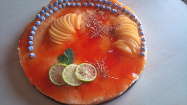- 6Il ne vous reste plus qu'à décorer, j'ai choisi des abricots coupés, des rondelles de citron, des copaux de chocolat, une feuille de menthe et de la chantilly colorée.