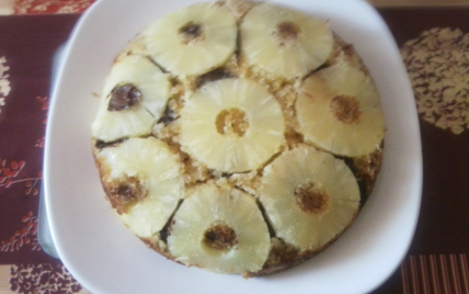 Gâteau au beurre avec des morceaux d'ananas entiers et des carrés de chocolat sur un lit de caramel.
