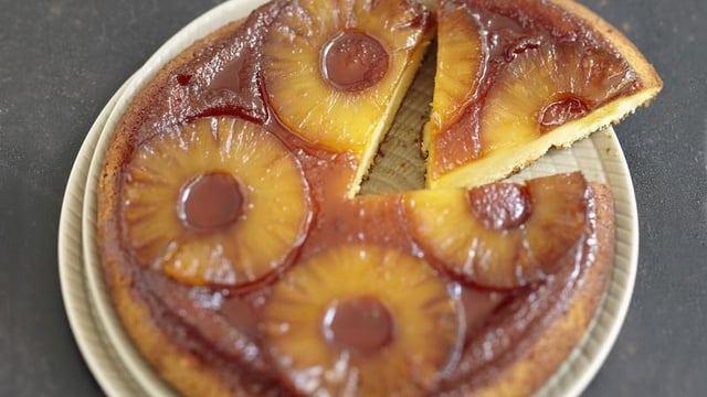 Répartissez les tranches d'ananas sur le fond du plat. Conservez le jus.
