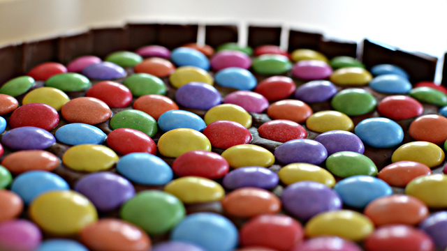 Etaler sur tout le gâteau et décorer avec des smarties. - 7On peut également faire un gâteau en forme de 8 encore plus facilement sans couper les gâteaux.