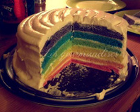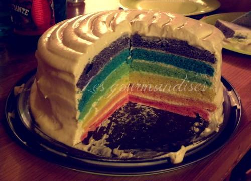 - 3MontageMettre sur un plat la génoise rose et à l'aide d'une Maryse garnir de chantilly puis déposez la génoise orange, la ganache, la génoise jaune, la ganache, la génoise verte, la ganache, la génoise bleue, la ganache, la génoise violette. Toujours à l'aide de la Maryse. Mettre de la ganache sur le dessus et sur le côté tout en lissant bien. Il ne vous reste plus qu'à mettre le gâteau au frais pendant un peu plus d'une heure et vous avez fini, enfin !