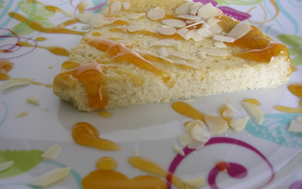Disposez le gâteau en parts sur des assiettes, nappez de coulis d'abricot et d'amamdes effilées et servez!