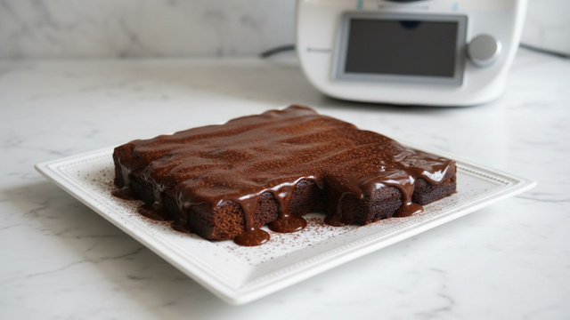 Biscuit chocolaté recouvert d'un ganache au chocolat, recouvert de poudre de cacao. Un gâteau gourmand et rapide à préparer, grâce au Thermomix. Recette pour Thermomix TM31, TM5 ou TM6.