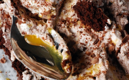 Quand le gâteau au chocolat est cuit laissez-le refroidir, puis étalez la crème et versez le sirop de passion. Vous pouvez également saupoudrer le tout d'un peu de chocolat râpé.