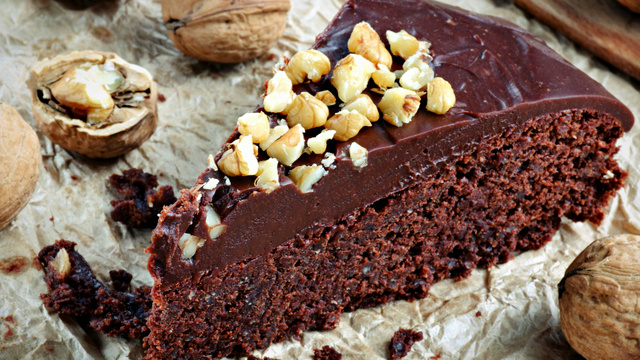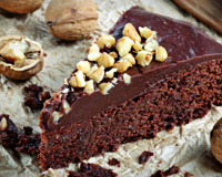Un gâteau très chocolat avec des noix en poudre et recouvert d'un glaçage au chocolat.