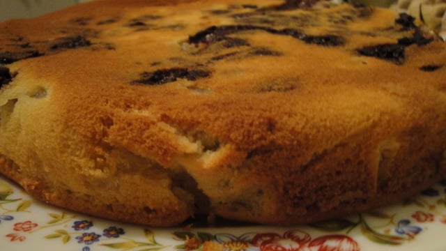 J'ai mis la pâte sans chocolat en dessous puis j'ai ajouté les poires au milieu et pour finir le chocolat fondu au dessus