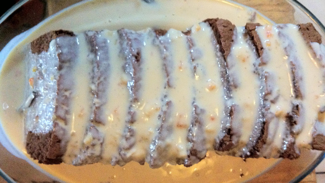 Faire bouillir 2 bols de lait entier avec du lait concentré sucré (selon votre goût) et des gousses de vanille. Juste avant ébullition, ajouter 1 cuillère à café et demi de custard en poudre.