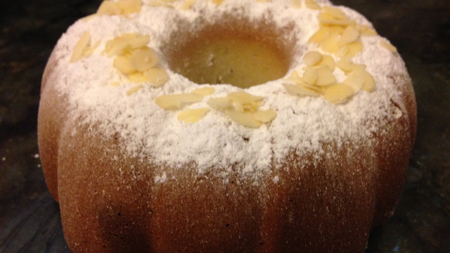 Une fois votre gâteau cuit, démoulez-le, saupoudrez-le de sucre glace et mettez lui les amandes effilées !