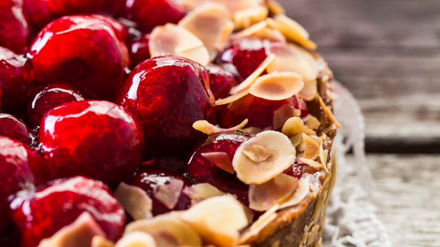 Démoulez le gâteau sur une grille. Laissez-le refroidir puis garnissez-le de cerises confites et d'amandes effilées.