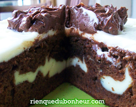 Il y a quelques temps de ça, j'étais tombée sur un blog anglais qui parlait d'une recette très populaire dans les années 1975 à la télévision anglaise ! Sa particularité était technique : utiliser une partie du glaçage dans la composition du gâteau lui-même...Submergée par l'envie irrépressible d'un gros gâteau totalement addictif, plein de moelleux, de douceur et de chocolat, je me suis lâchée ! Et donc, tout droit sorti de mon imagination gourmande...