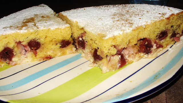 Mélanger la farine avec la Maïzena et la levure, ajouter le tout à la pâte en tamisant petit peu par petit peu. Égoutter les griottes dans une passoire.
