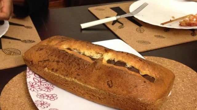 Versez la pâte obtenue dans le moule, installez les Kit Kat en ligne sur la longueur du gâteau (enfoncez les un peu) puis enfournez le gâteau durant 40 min.