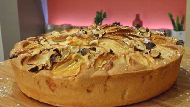 Disposer les lamelles de poires en les plantant verticalement dans la pâte. Enfourner en surveillant la couleur, une lame piquée dans le gâteau doit ressortir sèche. Laisser refroidir avant de démouler et de parsemer de noisettes concassées.