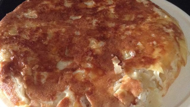 Verser dessus les pommes. Laisser cuire doucement, au moins 15 minutes et retourner comme une omelette pour cuire l'autre coté de 2 à 3 minutes.