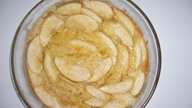 Couvrir la pâte des tranches de pommes en les faisant chevaucher. Enfourner à thermostat 4 et laisser cuire 25 min.