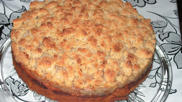 Cuire au four préchauffé à 180° pendant 30 mn. A la sortie du four, étalez la compote sur toute la surface du gâteau, puis recouvrez de pâte à crumble émiettée. Replacez au four 30 mn.