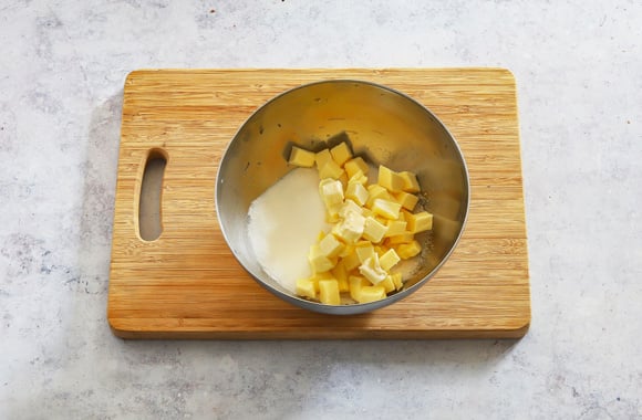 5Mettez le sucre dans semoule dans un saladier. Ajoutez le beurre ramolli coupé en morceaux.