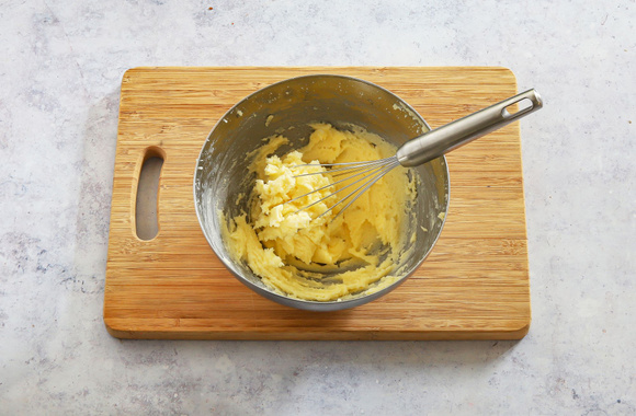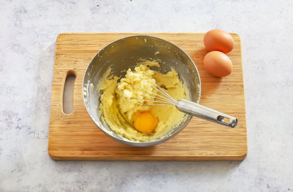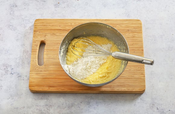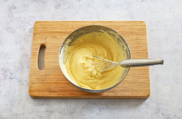 8Mélangez avec le fouet pour bien incorporer les oeufs et obtenir un mélange lisse.