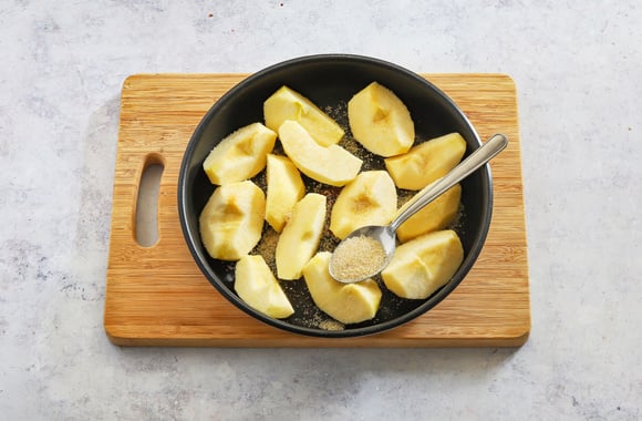2Mettez les quartiers de pommes dans une poêle anti-adhésive, saupoudrez-les avec la cassonade.