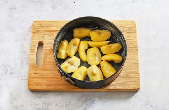 Pour démouler facilement ce gâteau, si vous n'avez pas un moule à charnière, beurré et chemisez de papier sulfurisé un moule à manque rond sans charnière, avant d'y mettre les pommes et d'y verser la pâte à gâteau.