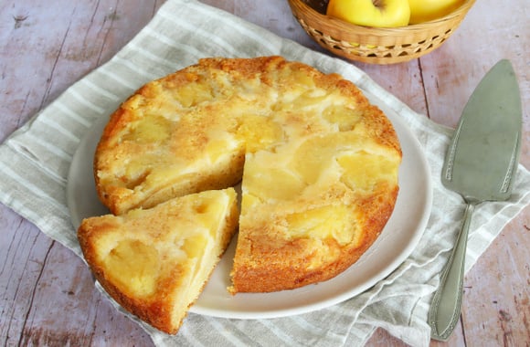 On adore ce gâteau aux pommes super facile à préparer, super moelleux et idéal pour le petit déjeuner, pour le goûter ou pour l'heure du thé. On le démoule à l'envers, façon tarte tatin, de manière à voir les pommes qui étaient sur le fond du moule pendant la cuisson. Pour ce gâteau, on fait caraméliser les pommes avec du sucre cassonade, ou avec du sucre muscovado qui n'est pas raffiné et apporte un goût supplémentaire aux pommes. A la place du sucre, on peut caraméliser les pommes dans du miel liquide. On peut s'amuser à préparer ce gâteau aux pommes à quatre mains avec les enfants, et on peut le parfumer avec de la cannelle, de la vanille ou encore du zeste de citron. Même les trois parfums en même temps ! Pour ce faire, ajoutez la cannelle au moment de caraméliser les pommes à la poêle, et ajoutez quelques gouttes d'extrait de vanille et du zeste de citron bio râpé sur la pâte à gâteau, au moment de mélanger les ingrédients. Vous allez vous régaler !
