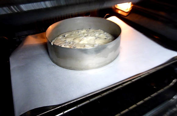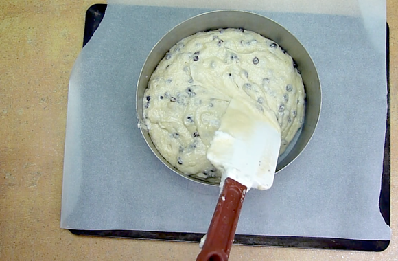 5Verser ensuite le beurre fondu et ajouter les raisins macérés égouttés. Mélanger pour bien rendre homogène la préparation. Verser l’appareil dans un cercle à entremet de 20 cm de diamètre chemisé.