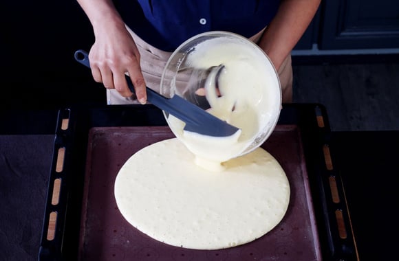 17Remplissez la moitié du gâteau avec une mousse au chocolat noir, lissez avec le dos d'une cuillère.