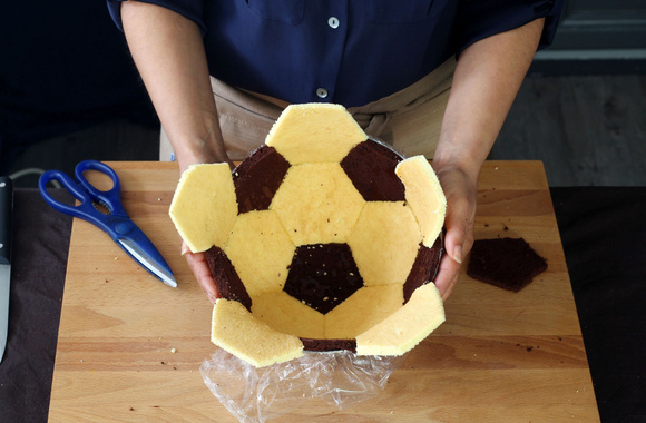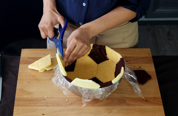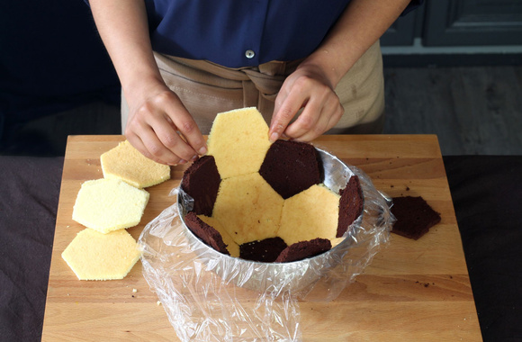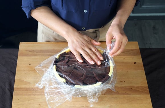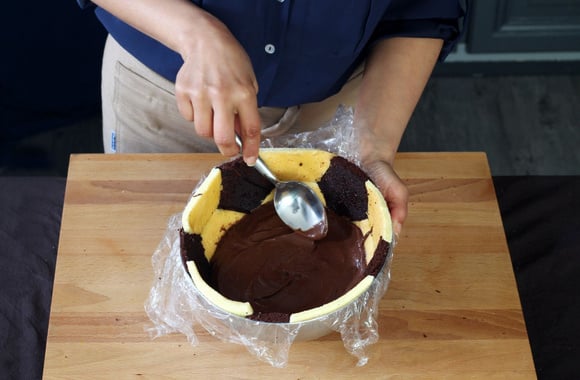 9Tapissez un cul-de-poule de 3,7 litre (25 cm) demi-sphérique avec du film étirable. Disposez au fond un morceau de génoise au chocolat.