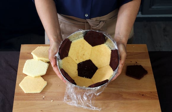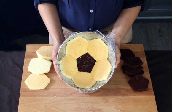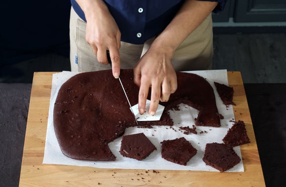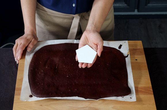 6A l'aide du patron en forme de pentagone et d'un couteau, coupez six morceaux de 5 faces dans la génoise chocolat, chaque coté mesurant exactement 4,6 cm.