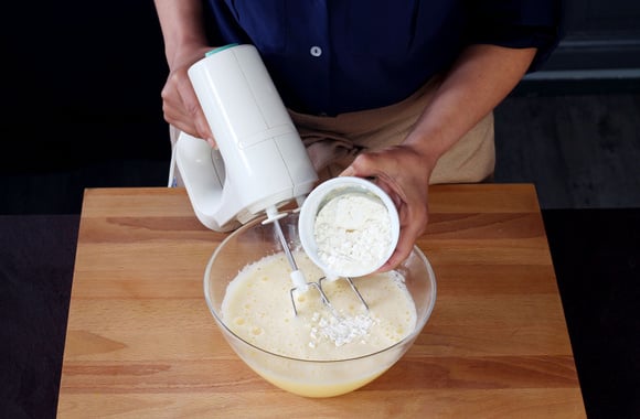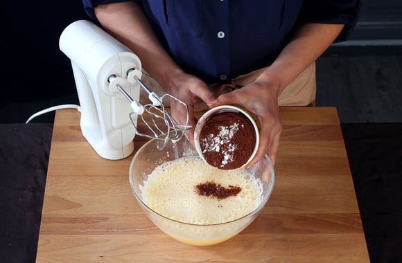 3Battez les oeufs et le sucre jusqu'à ce que le mélange devienne blanc et mousseux. Ajoutez la farine et le cacao tamisés et mélangez délicatement à l'aide d'une spatule.