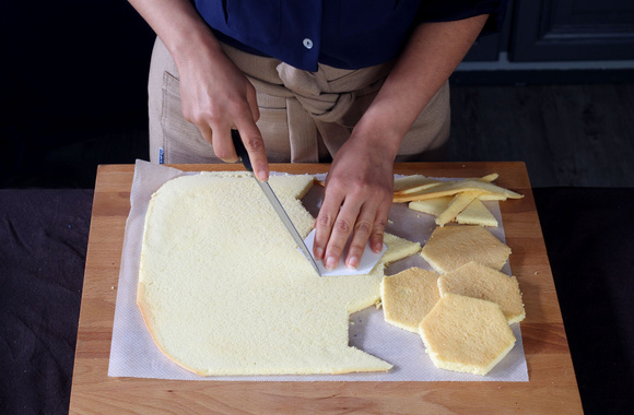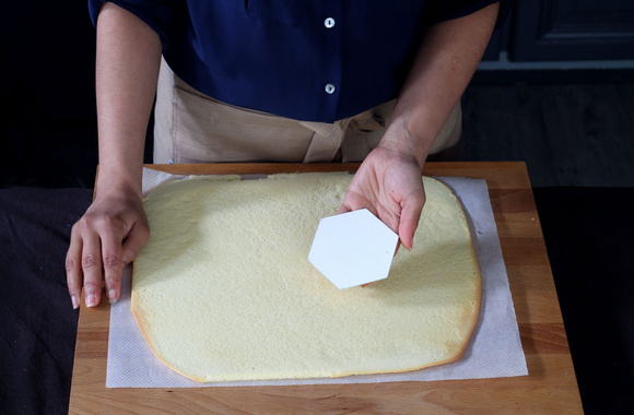 8A l'aide du patron en forme d'hexagone et d'un couteau, coupez dix morceaux de 6 côtés dans la génoise blanche d'une taille précise de 4,6 cm par côté.