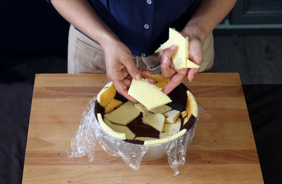 18Disposez les restes de génoise blanche sur une couche.
