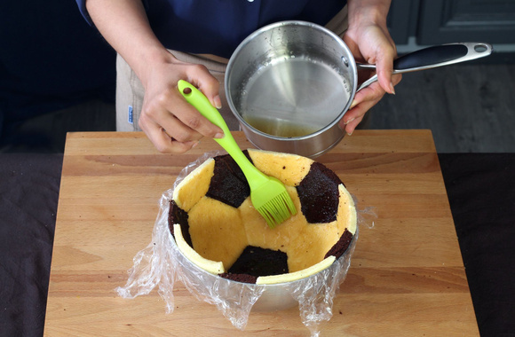 16Dans une casserole, portez à ébullition l'eau et le sucre. Arrêtez le feu et ajoutez l'extrait de vanille. Faites tiédir, puis à l'aide d'un pinceau, imbibez les génoises avec ce sirop.