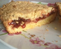 Ajouter le beurre mou. Bien mélanger. Diviser la pâte en 2 parties égales. Dans un moule rond, beurré et fariner, déposer la moitié de pâte. Ajouter 2 à 3 c à s de confiture, sans aller jusqu'aux bords. Recouvrir de l'autre pâte. Faire des stries et cuire 90 minutes.