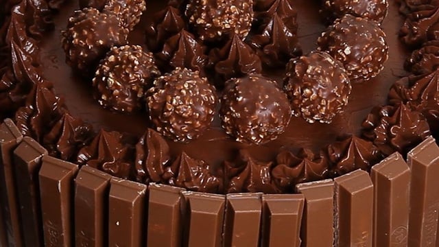 Une fois le gâteau cuit et refroidi, le couper délicatement en deux dans la longueur. Dans une assiette, déposer une moitié de gâteau et recouvrir de ganache au chocolat. Déposer l'autre moitié et recouvrir à nouveau de ganache. Lisser. Ajouter les Kit Kat tout autour du gâteau, à l'aide de la poche à douille décorer de ganache au chocolat sur le dessus et ajouter les Ferrero Rocher pour finir.